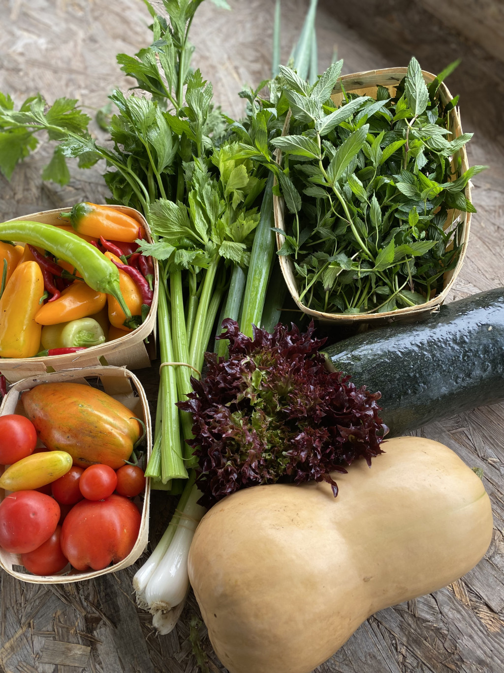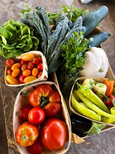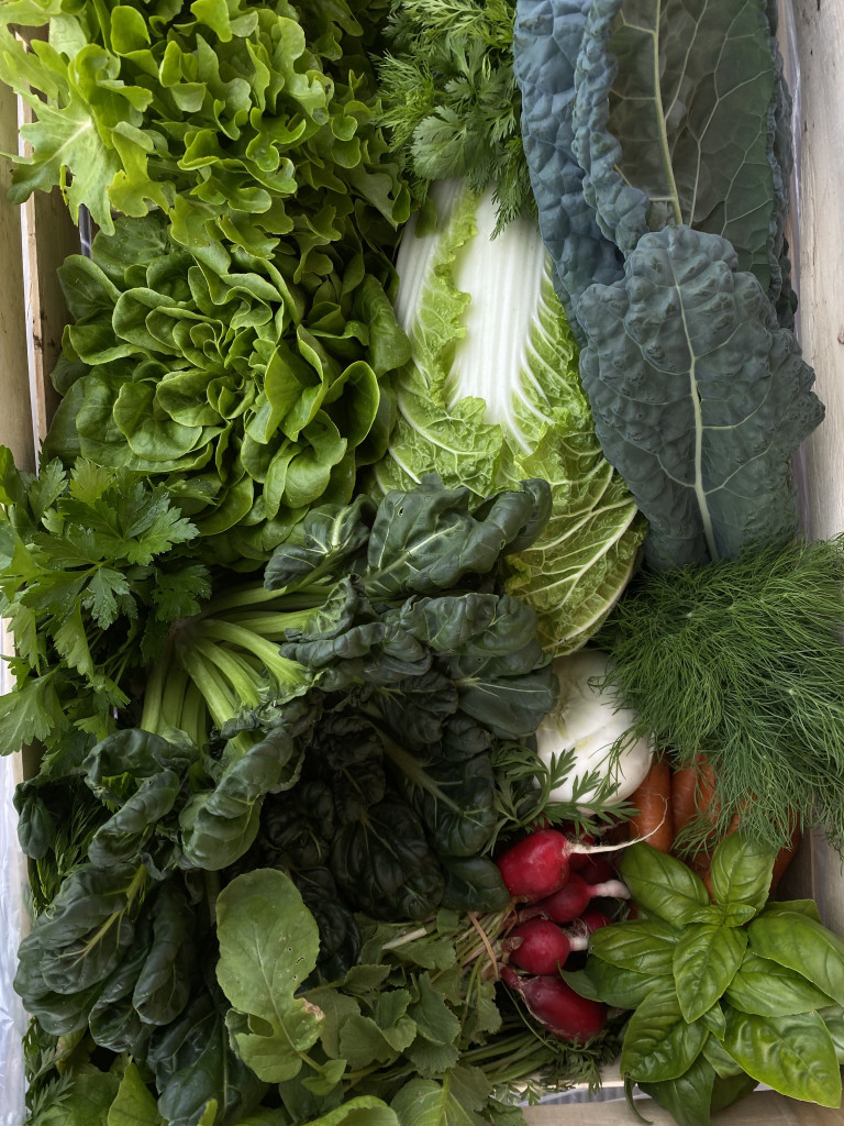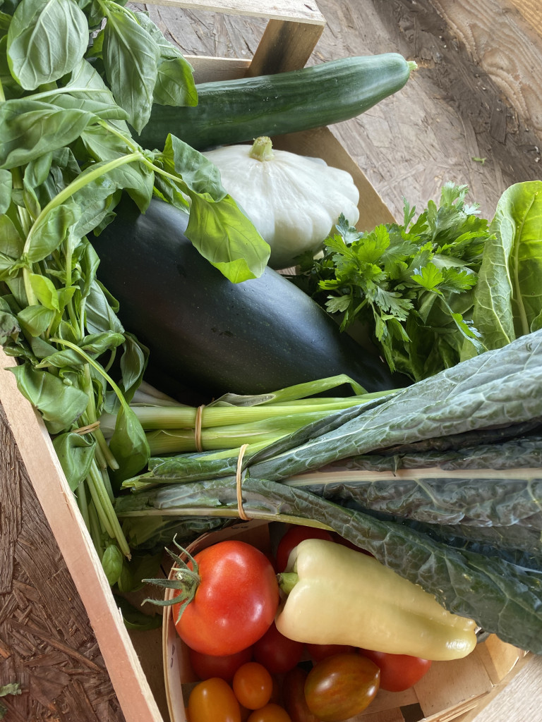 Tavasszal többek között spenót, mángold, pak choi, fodros kel, rukkola, saláta, retek, kötözőhagyma, cukorborsó kerül a kosarakba, nyáron és ősszel pedig káposztafélék, paradicsom, paprika, uborka, padlizsán, tökfélék, kötöző- és póréhagyma, gyökérzöldségek, csemegkukorica, fűszernövények.