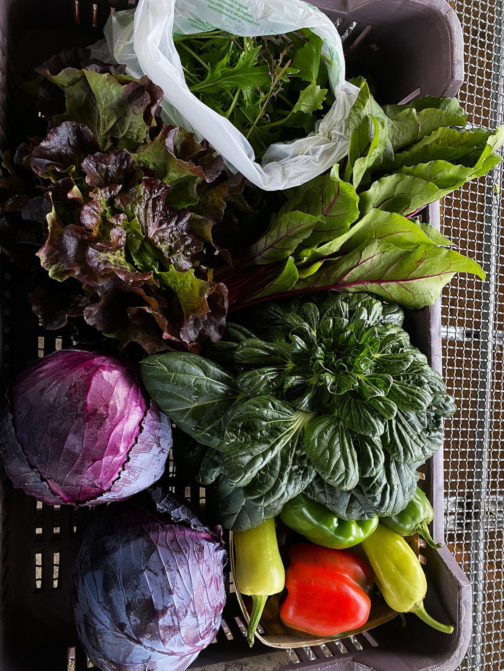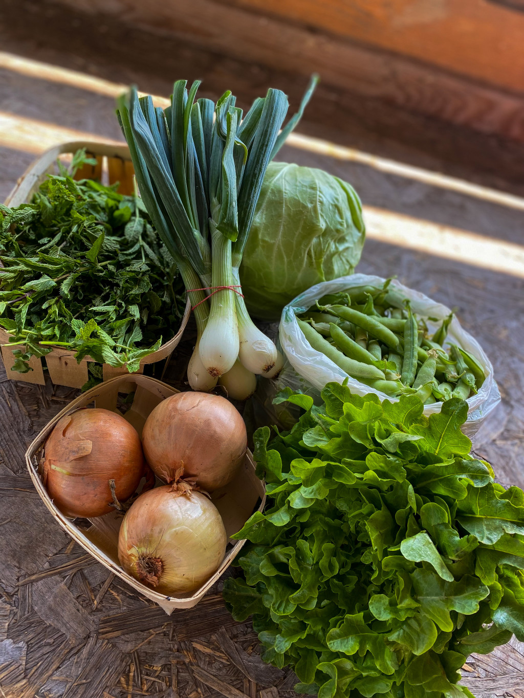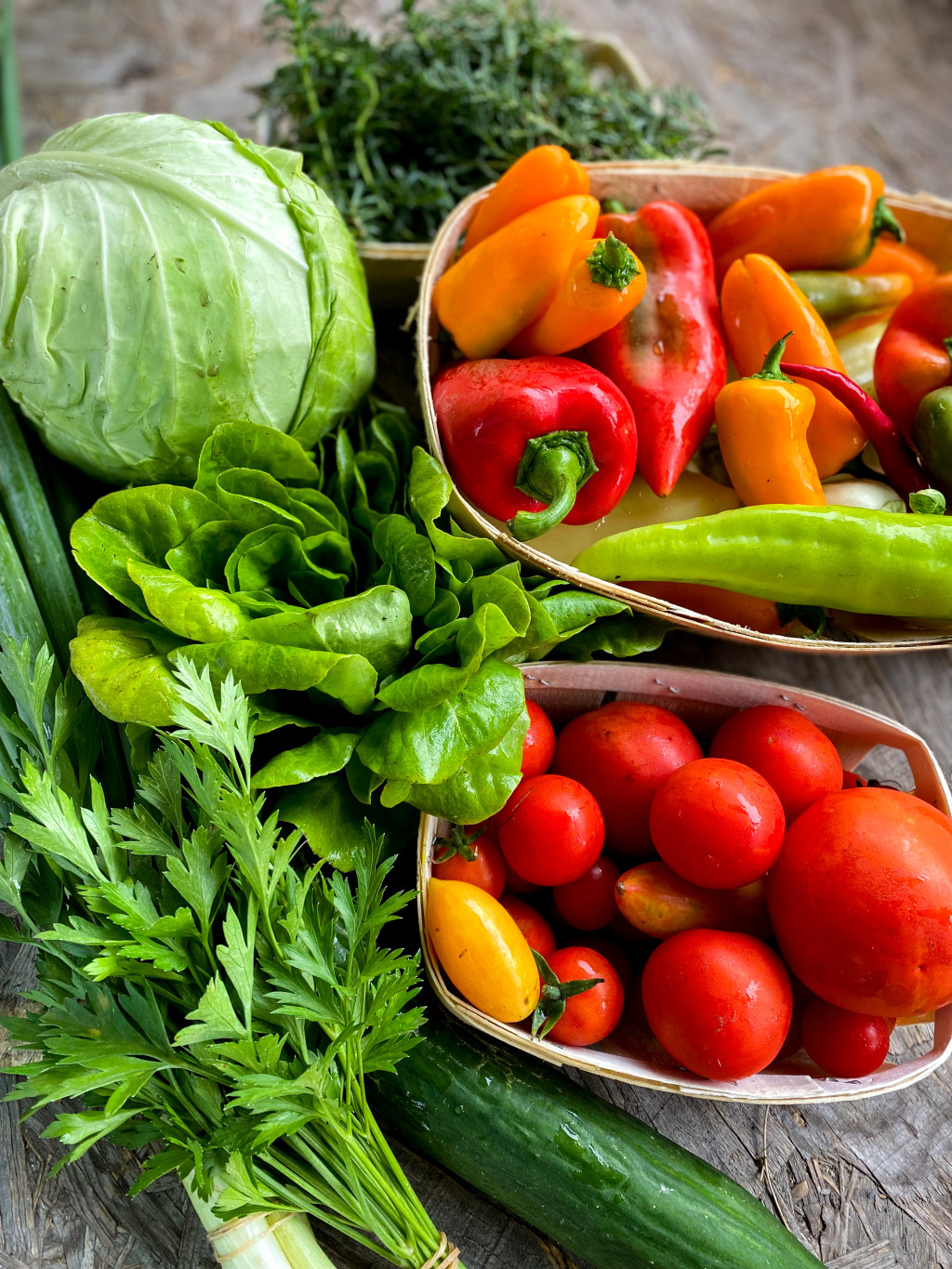 Tavasszal többek között spenót, mángold, pak choi, fodros kel, rukkola, saláta, retek, kötözőhagyma, cukorborsó kerül a kosarakba, nyáron és ősszel pedig káposztafélék, paradicsom, paprika, uborka, padlizsán, tökfélék, kötöző- és póréhagyma, gyökérzöldségek, csemegkukorica, fűszernövények.